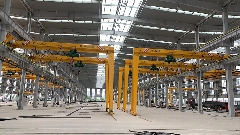 龍門起重機(jī)的起升機(jī)構(gòu)、小車運(yùn)行機(jī)構(gòu)和橋架結(jié)構(gòu),與橋式起重機(jī)基本相同。由于跨度大,起重機(jī)運(yùn)行機(jī)構(gòu)大多采用分別驅(qū)動方式,以防止起重機(jī)產(chǎn)生歪斜運(yùn)行而增加阻力,甚至發(fā)生事故。龍門起重機(jī)的起重小車在橋架上運(yùn)行,有的起重小車就是一臺臂架型起重機(jī)。橋架兩側(cè)的支腿一般都是剛性支腿;跨度超過30米時,常是一側(cè)為剛性支腿,而另一側(cè)通過球鉸和橋架連接的柔性支腿,使門架成為靜定系統(tǒng),這樣可以避免在外載荷作用下由于側(cè)向推力而引起附加應(yīng)力,也可補(bǔ)償橋架縱向的溫度變形龍門起重機(jī)的受風(fēng)面積大,為防止在強(qiáng)風(fēng)作用下滑行或翻倒,裝有測風(fēng)儀和與運(yùn)行機(jī)構(gòu)聯(lián)鎖的起重機(jī)夾軌器。橋架可以是兩端無懸臂的;也可以是一端有懸臂或兩端都有懸臂的,以擴(kuò)大作業(yè)范圍。半龍門起重機(jī)橋架一端有支腿,另一端無支腿,直接在高臺架上運(yùn)行。