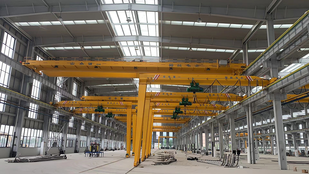 ?、墼齑堥T起重機:用于船臺拼裝船體,常備有兩臺起重小車:一臺有兩個主鉤,在橋架上翼緣的軌道上運行;另一臺有一個主鉤和一個副鉤,在橋架下翼緣的軌道上運行,以便翻轉(zhuǎn)和吊裝大型的船體分段。起重量一般為100~1500噸;跨度達185米;起升速度為 2~15米/分,還有0.1~0.5米/分的微動速度。